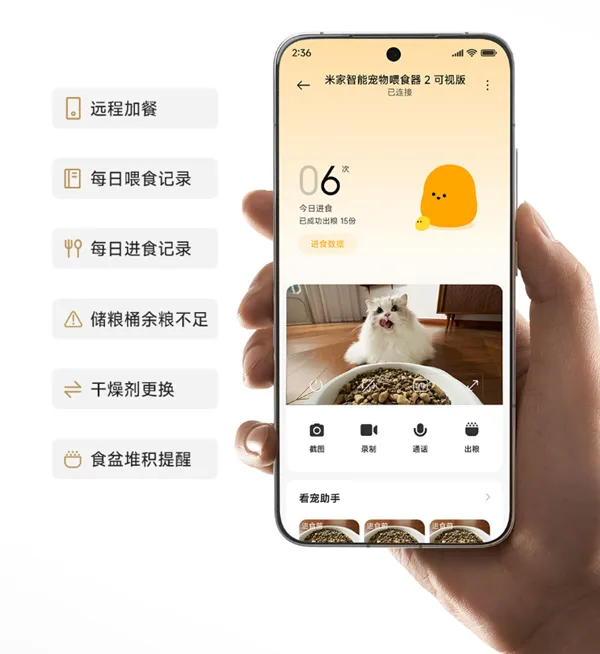 此外,裝置支援小米澎湃智聯,可跨裝置呼喚小愛同學實現語音加餐,還能聯動小米其他智能裝置,自定義回家離家場景,回家自動關閉鏡頭。米家 APP 還能記錄餵食數據、推送餘糧不足和乾燥劑更換提醒,讓養寵更安心。