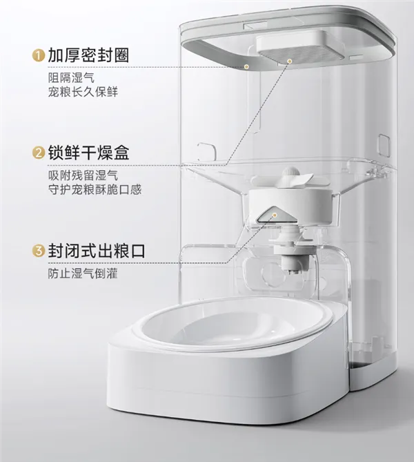 其配備 5L 儲糧桶可裝 2.5kg 寵糧,滿足單只成年貓 30 天食量,兼容 18mm 及以下糧種,自帶自動糾錯回轉機制有效防卡糧,餘糧不足時仍能供單貓食用 1-2 天。三重鎖鮮設計搭配乾燥盒,能有效阻隔濕氣,讓寵糧長久保鮮。產品還內置緊急供電系統,安裝四粒 AA 電池後,意外斷電也能按計劃出糧。