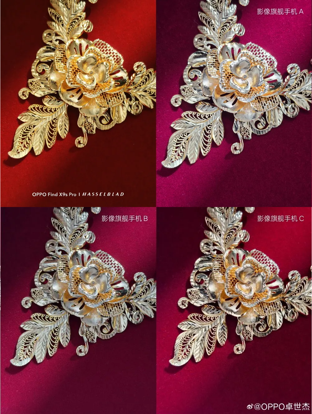 卓世傑曬出的對比樣張也印證了這一點:在常見的紅底黃金展示櫥窗環境中,友商機型拍出的照片色彩已經嚴重偏離真實情況,而 Find X9s Pro 則能夠忠實地還原出黃金那種純正、高級的色澤。OPPO Find X9 Ultra 和 Find X9s Pro 將於4月21日晚上7點正式登場。