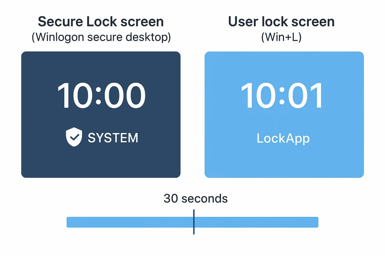 系統這樣設計的目的在於節省系統資源。安全鎖屏畫面運行於 Winlogon 安全桌面下,屬於 SYSTEM 帳戶權限,當進入該界面後,系統的時鐘畫面刷新頻率會降至 30秒一次,所以無法與系統時鐘對齊,會出現最多 30秒的顯示延遲。