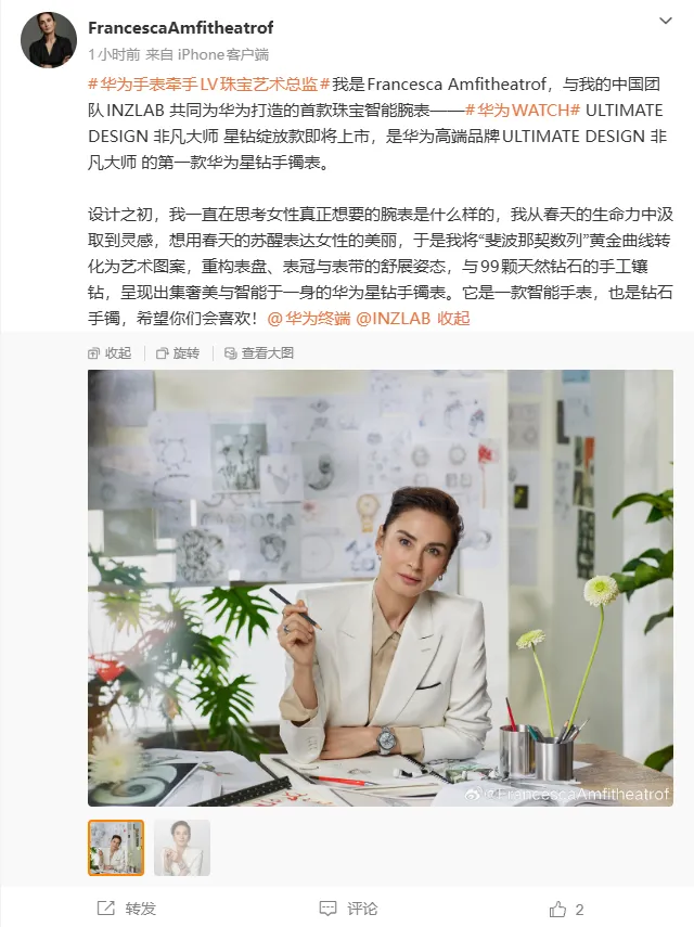 設計方面,作為 ULTIMATE DESIGN 非凡大師系列首款星鑽手鐲錶,華為首款珠寶智能腕錶。由華為聯合 LV 前珠寶藝術總監、國際知名珠寶設計師 Francesca Amfitheatrof 進行設計。