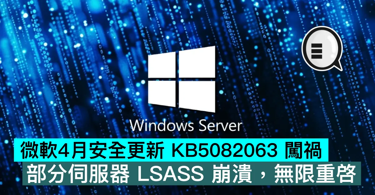 近期,微軟確認 4月安全更新 KB5082063 會在部分 Windows 伺服器上出現嚴重 bug,導致安全授權子系統服務(LSASS)出現崩潰,裝置因此陷入無限重啓循環。