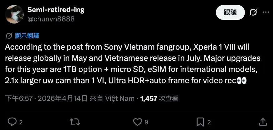 據爆料人士透露, SONY 新一代旗艦手機 Xperia 1 VIII 全球版將於今年 5月正式發佈,越南地區版本則定於 7月發售。這款機型在 ROM、影像、設計等方面均迎來顯著升級,備受 Android 旗艦用戶關注。