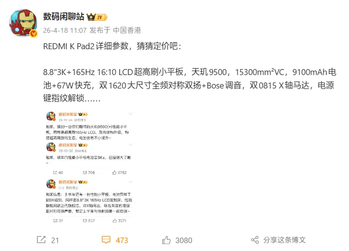 小米 REDMI K Pad 2 與 K90 Max 均在 4月 21日 19:00正式推出,官方對於 REDMI K Pad 2 定位是「口袋性能魔王」。消息源博主 @數碼閒聊站 展示了該機的詳細參數,讓大家猜該機的最終定價。