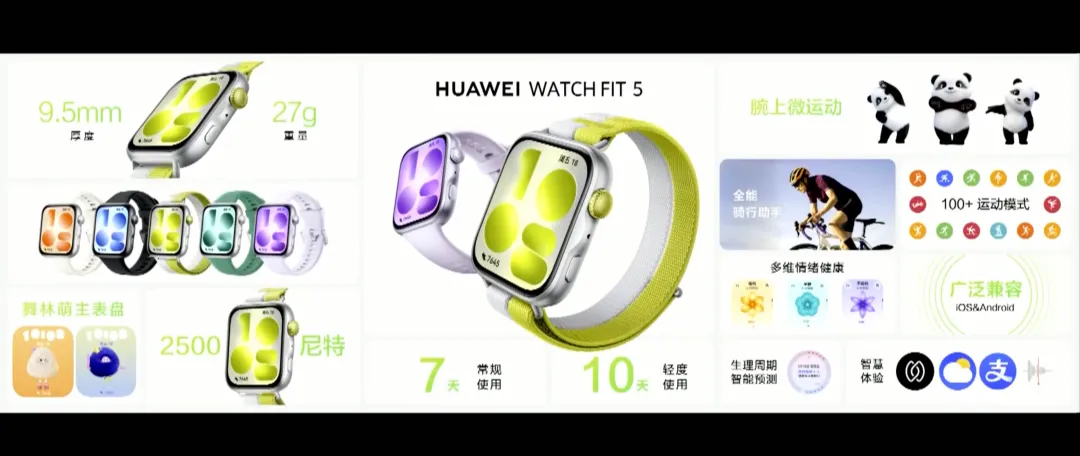 HUAWEI WATCH FIT 5 主打極致的輕薄潮流體驗。其機身重量僅為 27克,厚度控制在 9.5mm,戴在手腕上幾乎無負重感,非常適合全天候佩戴及睡眠監測。用料方面兼顧輕便與環保,採用了再生鋁合金機身與再生玻纖底殼。
