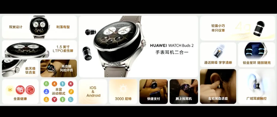 二合一產品線也迎來了重磅更新,HUAWEI WATCH Buds 2 時隔三年回歸,在集成度與質感上實現了飛躍。該腕表採用航天級鈦合金表體,整機重量相比上代減輕 12克,僅為 54.5克(不含錶帶)。正面搭載 1.5吋 LTPO AMOLED 柔性屏幕,黑邊大幅收窄,解像度為 466×466,峰值亮度高達 3000nit 。內置的真無線耳機單只僅重約 4克,支援不區分左右耳的自適應識別,放回表體即可通過環繞充電環隨時補電。