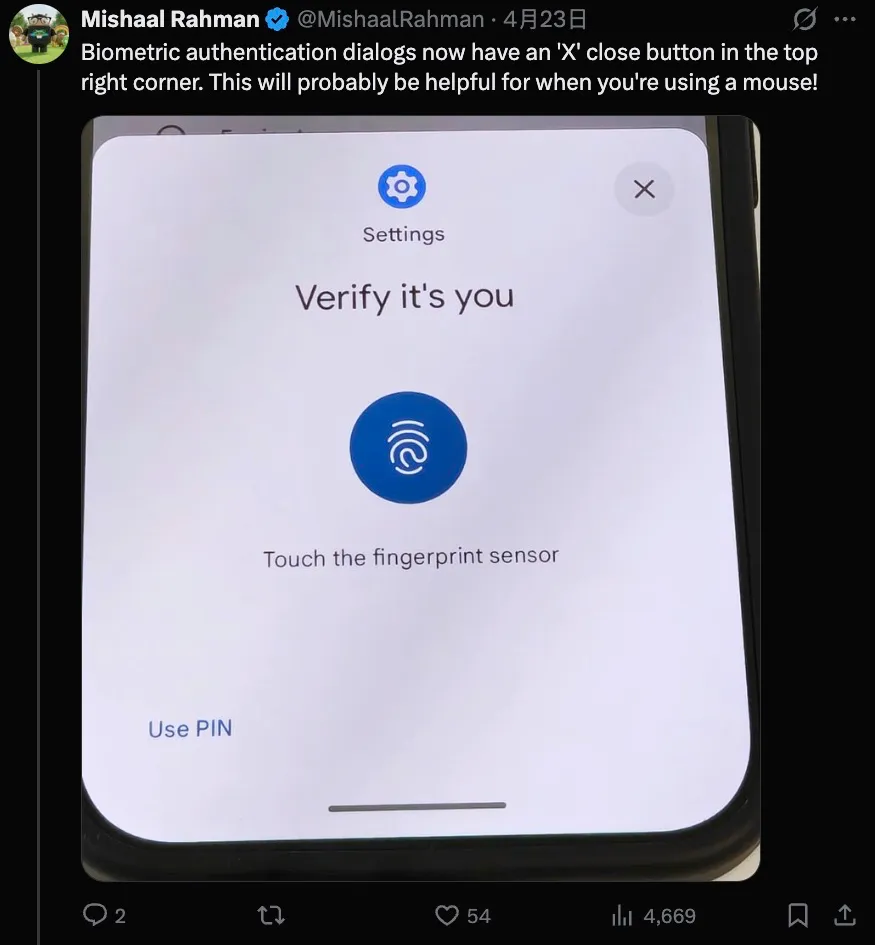 Android 17 還針對生物識別對話框調整了交互方式,在彈窗右上角新增了「X」關閉按鈕,用戶可以直接點擊退出,無需像過去那樣完全依賴 Android 的通用返回手勢。這一顯式退出入口對鍵鼠操控場景更為友好。