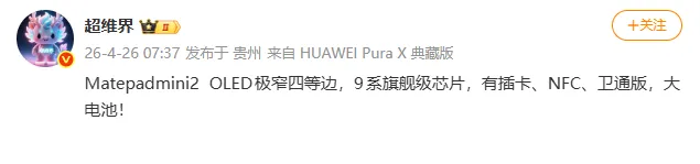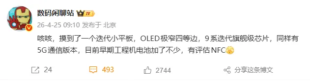 博主 @數碼閒聊站 曝光一款小尺寸平板新品,從其配置推測,可能是華為全新 MatePad Mini 2。