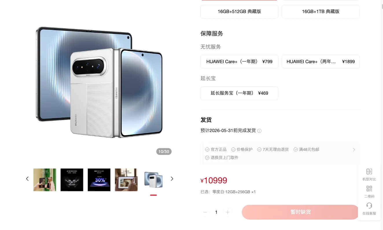 HUAWEI Pura X Max 正式通過全渠道啓動首銷。該機定位於新形態高階旗艦,提供 12GB+256GB 與 16GB+1TB 典藏版兩種規格,售價分別為 10999元和 13999元。儘管定價邁入萬元級別,該機在上架後仍被迅速搶購一空。