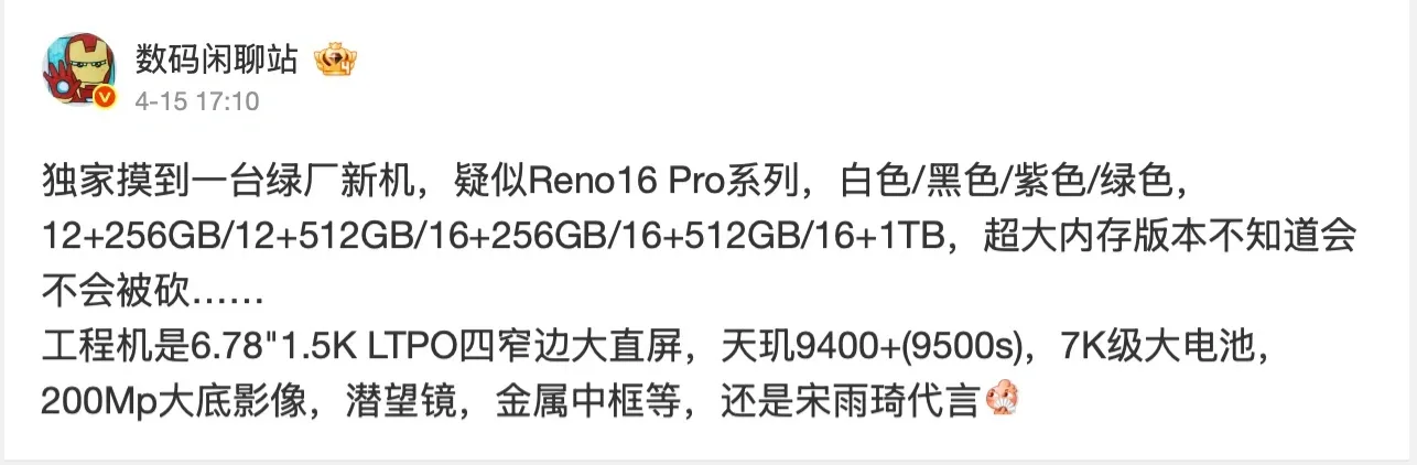 消息源 @數碼閒聊站 之前爆料過,摸到過綠廠新機,可能是 Reno 16 Pro,這款機型搭載 6.78吋 1.5K LTPO 四窄邊直屏,金屬中框設計,提供白、黑、紫、綠四種配色。手機配備了天璣 9400+(或天璣 9500s)處理器,內置 7000mAh 級別大電池,影像擁有 2億像素大底主鏡、潛望長焦鏡頭。版本有 12GB+256GB、12GB+512GB、16GB+256GB、16GB+512GB、16GB+1TB,Reno 16 系列的具體情況需要等官方後續公佈。